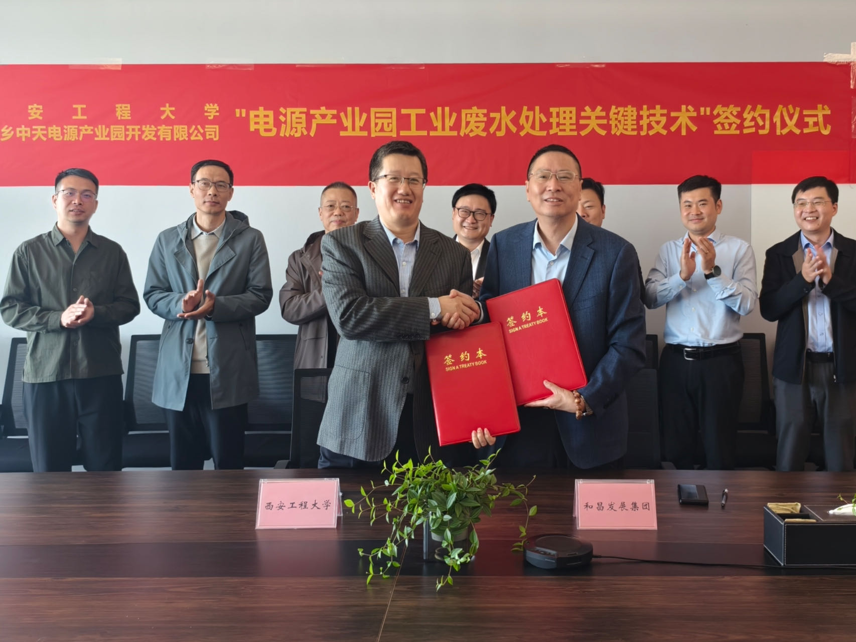 最后,武占省与黎东平分别代表双方签署《我校与新乡中天电源产业园开发有限公司“电源产业园工业废水处理关键技术”项目合同》。