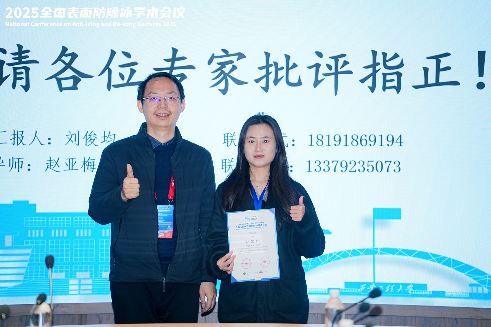 赵亚梅教授受邀主持分会场,以“超疏水表面构建的功能化与应用性初探”为题,介绍超疏水表面构建思路、方法、性能提升途径及课题组2025年最新研究成果,并与专家、学者深入交流讨论。刘俊均同学在分论坛中,以“耐久型碳基光热超疏水的应用及其性能研究”为题,汇报了耐久型碳基光热超疏水材料技术优势、制备工艺与性能优化策略,以及该材料在金属表面防结冰等研究进展,积极交流学习,展现我校研究生良好精神风貌、科研能力和综合素养。